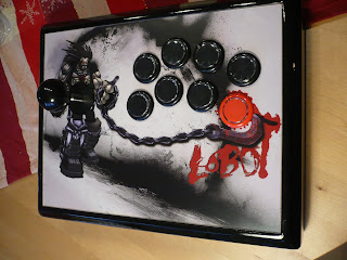 Das Teil kann mit anderen Kabeln auf beliebige andere Konsolen umgerüstet werden. Es wird einfach nur ein neues Kabel eingesteckt und man kann Gamecube, Wii, SNES, NES , Sega Konsolen, alte Atari Konsolen, NeoGeo und und und anschließen. Vom technischen Standpunkt sind hier keine Wünsche mehr offen. Das Gehäuse hat einen schwarzen Spiegellack und rotes transparentes Bodenplexi. Das Artwork von Jürgen finde ich sehr gelungen. Bei diesem Gehäuse ist die Oberplatte verschraubt und kann einfach komplett ausgetauscht werden. Das könnte man zum Beispiel machen, wnn man Stickeinheit, Artwork und so weiter in einem Rutsch wechseln möchte.